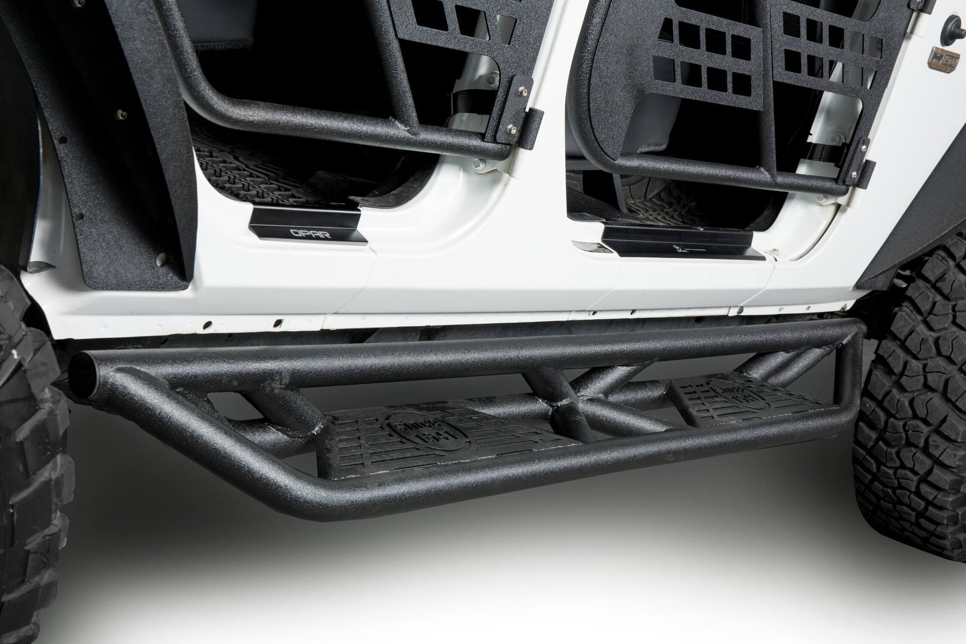 These Side Steps include wide step areas that are die-stamped for slip resistance. The heavy-duty punch plates also assist in ensuring your foot doesn't slide as you climb into your Jeep Wrangler. The finish is textured black over steel.