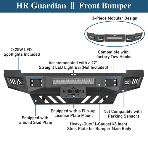 Aggressive Appearance. The Guardian II Front Bumper is a robust and protective addition to your vehicle. Its three-piece modular design provides a tight contour fit to the vehicle, offering an aggressive look and enhanced protection. The bumper features a large, durable frame with honeycomb steel plate accents, giving it a rugged, off-road appearance. It comes equipped with two 25W LED spotlights for improved nighttime visibility and includes a flip-up license plate mount. Additionally, the bumper accommodates a 22-inch straight LED light bar (not included) and is compatible with factory tow hooks for added versatility. The integrated solid skid plate further enhances front-end protection, especially in off-road conditions.