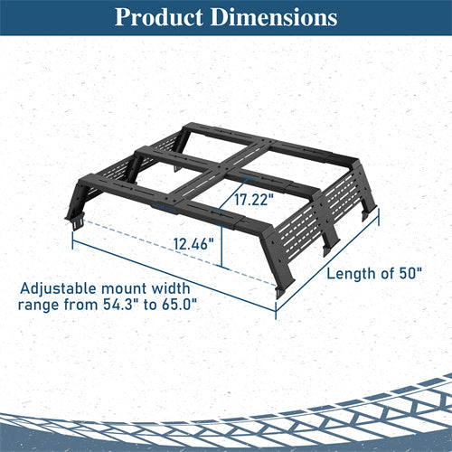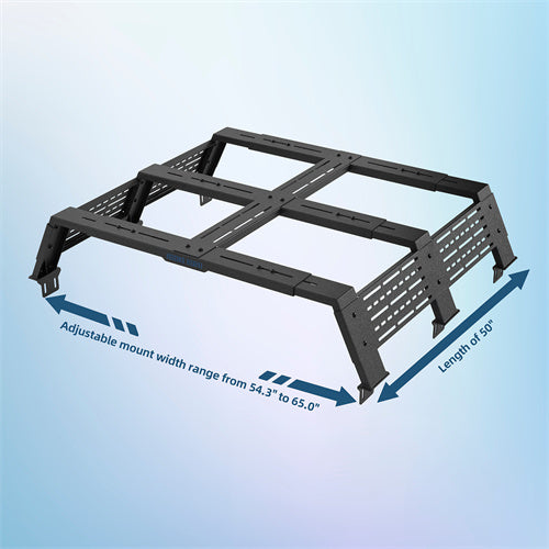 Expand Your Truck's Utility. The Overland Bed Rack System offers a low-profile yet functional design. Its top and side panels feature numerous elongated cutouts, making it easy to mount a wide range of accessories such as lights, high lift jacks, roof top tent, and more. With a fixed length of 50 inches and an adjustable width ranging from 54.3 to 65.0 inches, it fits a variety of truck beds. The rack supports up to 400 lbs of dynamic weight and 800 lbs of static weight when evenly distributed, making it ideal for both on-road and off-road adventures.