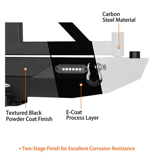 - DIFFERENT TRAIL REAR BUMPER - Heavy-duty steel construction: 11-gauge(1/8 inch) plate for the bumper main body; 2" Standard Hitch Receiver; Can Accommodate Up to a 37" Tire; High Strength D-Ring Mounts w/ D-Rings Included; Two Stage Textured Black Powder Coat Finish; Rock Crawler Rear Bumper with Tire Carrier, don't open with door