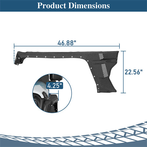 Heavy-Duty Construction. Manufactured for maximum durability, these Fender Flares are crafted from carbon steel plate, allowing them to take on anything the trail throws at them. These Fender Flares are finished in a 2-stage e-coating and high-grade, textured black powder coating for durability and long-lasting corrosion resistance.