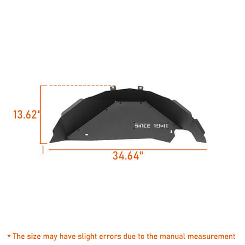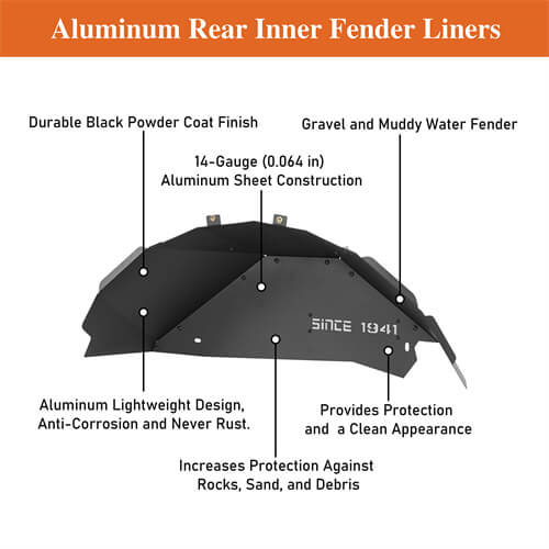 Additional Protection. The Aluminum Rear Inner Fender Liners are specifically designed to offer top-tier protection and a touch of style for your vehicle. Adorned with the iconic 'SINCE 1941', they not only provide a distinctive appearance but also serve a practical function. Serving as a sturdy shield against gravel, muddy water, rocks, sand, and debris, these fender liners guarantee the safety of your vehicle's rear end, especially during adventurous off-road journeys.