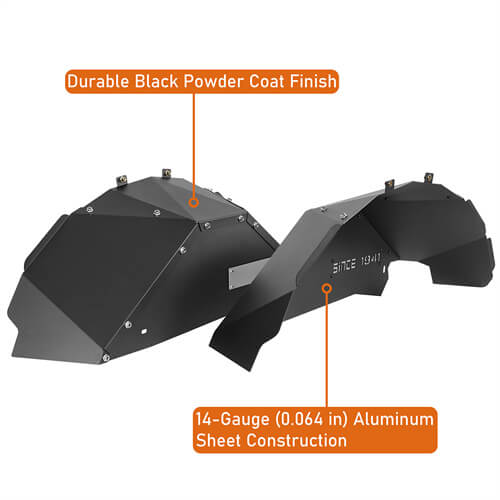 Durable Aluminum Construction. These Aluminum Rear Inner Fender Liners are meticulously crafted from 14-gauge aluminum sheet construction, ensuring they are resilient against tough terrains and challenging conditions. Their sturdy design, paired with a durable black powder coat finish, guarantees durability and resistance to the elements. The sleek black powder coat not only boosts their longevity but also bestows a stylish, stealthy look to your vehicle.