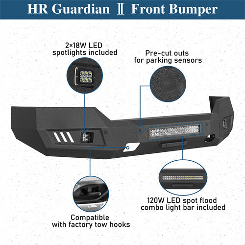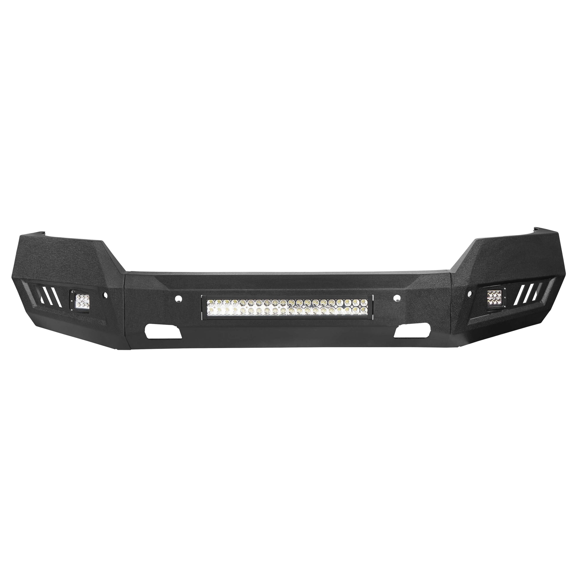 Aggressive Styling. Front Bumper will give your 2016-2018 Chevrolet Silverado 1500 an aggressive, off-road appearance. Engineered to easily replace your stock bumper, the Front Bumper features a pair of LED spotlights and a 90W LEd light bar to light the way. Built tough from heavy duty steel plate, this Bumper is ideal for street, work and off-road applications.
