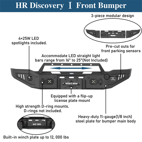 Front Side Protection. The Discovery I Front Bumper is a robust and versatile accessory designed for off-road enthusiasts. It features four 25W LED spotlights that provide excellent illumination for nighttime adventures. The bumper is engineered with high-strength D-ring mounts welded inside and out, boasting a 4.75-ton capacity for secure recovery operations. Additionally, it includes a built-in winch plate that supports up to 12,000 lbs, offering reliable performance for challenging recoveries.