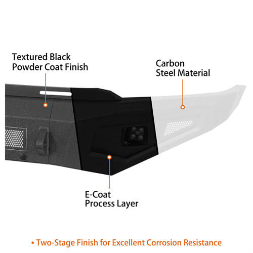Heavy Duty Construction. The Guardian Ⅰ Front Bumper is constructed from heavy-duty, high tensile 11-gauge steel for the main body, ensuring robust durability and strength. The mounting structure is made from 8-gauge steel, providing a solid foundation for secure installation. The bumper is finished with a textured black powder coat, which enhances its visual appeal and adds an extra layer of protection against corrosion and wear. Additionally, the interior is treated with a premium E-coating process, ensuring comprehensive protection against rust and prolonging the lifespan of the bumper.