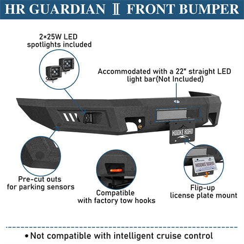 Rugged Styling. The Guardian Ⅱ Front Bumper is designed for both rugged style and practical functionality. It comes equipped with two bright 25W LED spotlights to enhance visibility in low-light conditions and features a distinctive honeycomb steel plate for added visual appeal and durability. A convenient flip-up license plate mount is included. Please note that it is not compatible with intelligent cruise control.