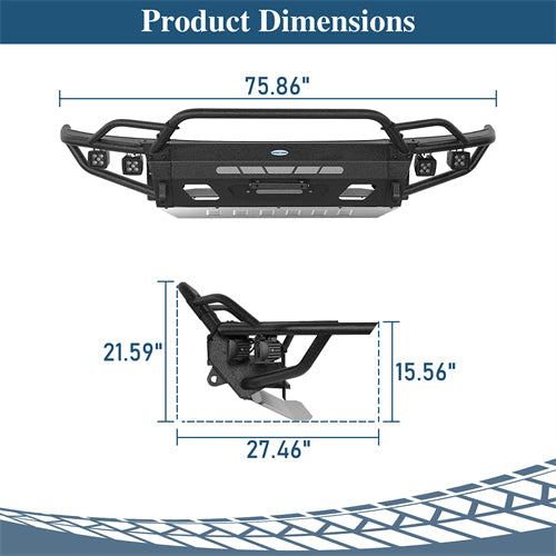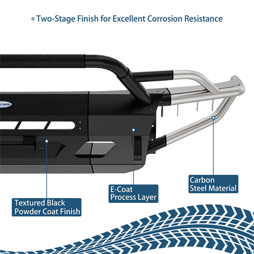 Solid Steel Construction. Crafted from premium materials, the ExplorerX Tube Front Bumper ensures superior durability and long-lasting performance. The main body is constructed from heavy-duty 11-gauge (1/8-inch) steel plate, while the bull bar utilizes 1.57"×0.06" steel tubing for structural reinforcement. The winch plate and mounting structure are built from 9-gauge (5/32-inch) steel for maximum strength under heavy loads. The armored silver stainless steel skid plate not only enhances underbody protection but also adds a striking visual contrast to the rugged design. Finished with a textured black powder coat exterior and a premium E-coating on the inside, this bumper offers excellent resistance against rust, corrosion, and harsh outdoor elements, ensuring it stands up to the demands of off-road and overland adventures.