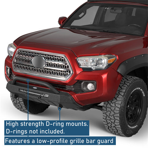 Rugged Styling and Protection. The Blink Stubby Front Bumper is designed to offer both functionality and style for Tacoma owners seeking a balance between daily driving and light off-roading. Its classic, low-profile design features a sturdy grille guard that enhances the front-end protection without overwhelming the truck's aesthetic. This bumper is equipped with high-strength D-ring mounts, providing recovery options when needed, though D-rings are not included. Additionally, the inclusion of a 72W LED spotlight bar ensures better nighttime visibility, making it a practical upgrade for adventurers and commuters alike. A flip-up license plate mount is also integrated into the design for added convenience.
