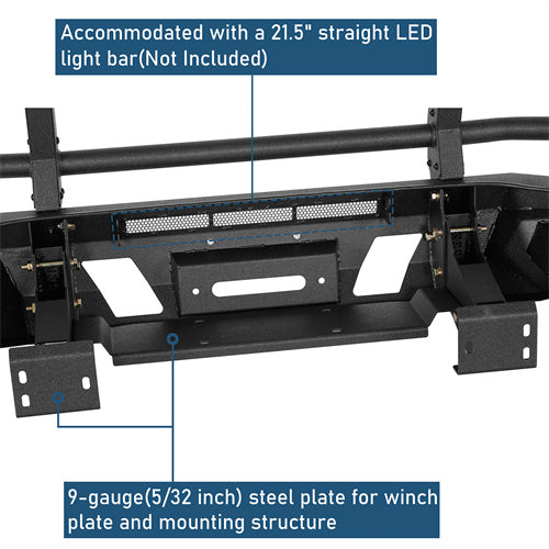 - Heavy-duty 11-gauge(1/8 inch) steel plate for the bumper main body, 1.89"×0.06" steel tube for the tube structure, 9-gauge(5/32 inch) steel plate for the winch plate and the mounting structure.