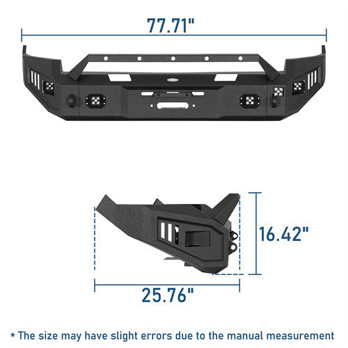 Bold off-road aesthetics. The Discovery I Front Bumper is a rugged and versatile addition to your off-road vehicle. Its three-piece modular design offers robust protection against off-road hazards while safeguarding the front end. It includes 4×25W LED spotlights for enhanced visibility and high-strength D-ring mounts with a 4.75-ton capacity. A built-in winch plate supports up to a 12,000 lbs winch, and the flip-up license plate mounting bracket adds convenience.