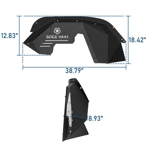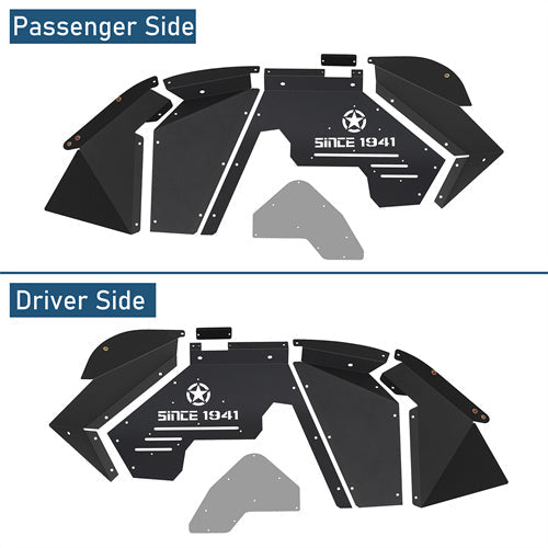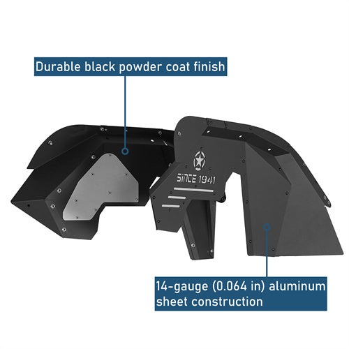 Sturdy Aluminum Construction. Crafted with precision from 14-gauge aluminum sheet construction, these inner fender liners are built to withstand rugged terrains and harsh conditions. Their robust design, coupled with a durable black powder coat finish, ensures longevity and resilience against the elements. The black powder coat not only enhances its durability but also adds a sleek, stealthy aesthetic to your vehicle, merging practicality with style seamlessly for an elevated off-road experience.