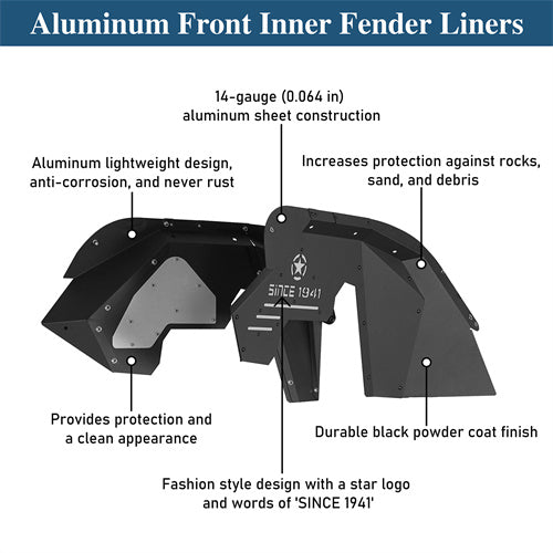 Extra Protection. The Aluminum Front Inner Fender Liners offer protection and a polished appearance to your vehicle. These inner fender liners act as a sturdy barrier against gravel, muddy water, rocks, sand, and debris, ensuring your vehicle's undercarriage remains safeguarded from potential damage. Featuring a stylish fashion design adorned with a distinctive star logo and the iconic 'SINCE 1941' inscription, they shield your vehicle and add a touch of personality.