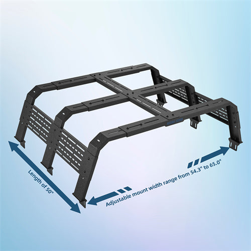 Expand Your Truck's Utility. The Full Size Overland Bed Rack System is a heavy-duty, custom-designed solution for maximum utility and versatility. It features a 50" length and an adjustable width (54.3" to 65.0") to fit various truck beds. The top mounting points and side panels with long hole cutouts allow for endless accessory configurations, including lights, roof top tent, and bike mounts, among others. With a 400 lb dynamic and 800 lb static weight capacity, this rack ensures durability for overland adventures.