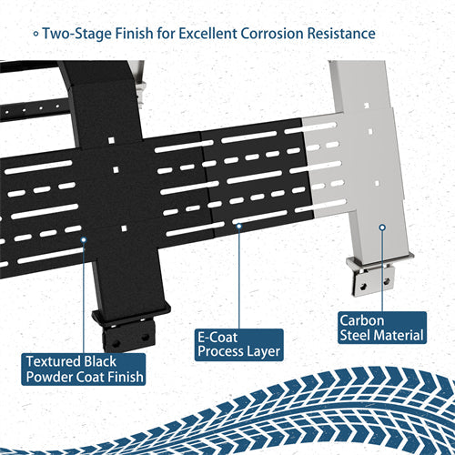 Heavy Duty Construction. Constructed from heavy-duty, high-tensile 13-gauge (3/32 inch) steel plate for the main structure and 9-gauge (5/32 inch) steel plate for the mounting points, the Full Size Overland Bed Rack System offers exceptional strength and durability. Its reinforced rib design enhances structural integrity for demanding off-road use. The textured black powder coat finish, combined with a premium E-coating process inside, ensures long-lasting corrosion resistance and rugged style.