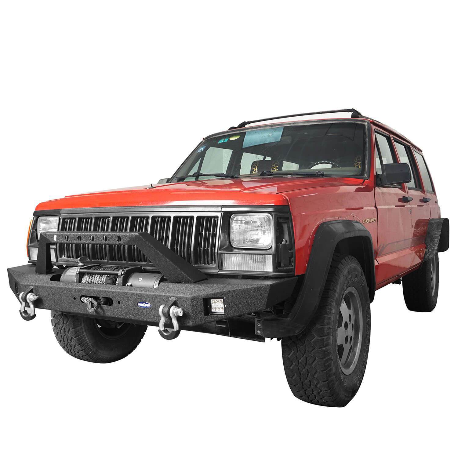 - Full-Width Front Bumper w/ Winch Plate & LED Spotlights for 1984-2001Jeep Cherokee XJ