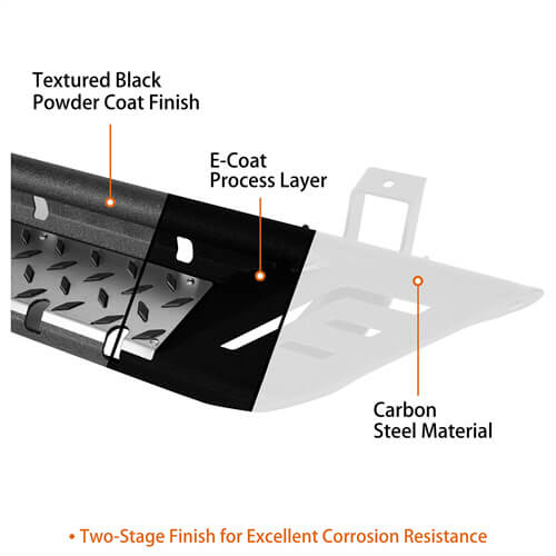 Durable Construction. These side steps are crafted from quality steel for impressive strength and long-lasting use. They feature a tough, textured black powder coat finish for aggressive styling that will also help prevent damaging rust and corrosion.