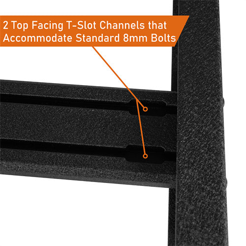 - The 2 top facing T-slot channels offer numerous solutions for tie-down options, cargo security, and the addition of accessories such as lights, shower system, recovery boards, rubber clamps, fuel containers, etc