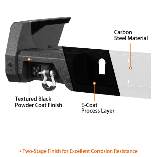 - Heavy-duty, high tensile 11-gauge (1/8 in) steel for bumper main body, 9-gauge(5/32 in) steel plate for the mounting structure