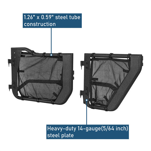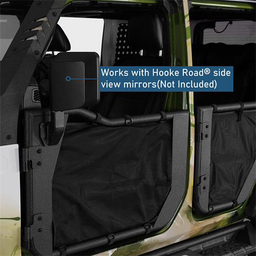 Adventure Style. New for the Wrangler JL is the Tubular Off-Road Doors. These doors provide added visibility while off-road and offer a mounting location for side-view mirrors. Not fit the factory side mirrors. These doors are designed to provide maximum strength and a perfect fit on your specific Wrangler. The unique design adds style to your rig without compromising any sturdiness. It also comes with black mesh that provides some privacy protection for passengers.