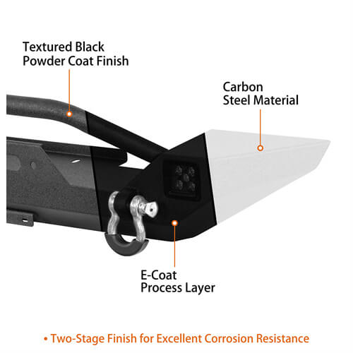 Heavy Duty Construction. Built with heavy-duty steel construction, using 11-gauge (1/8 inch) steel for this front bumper main body and a robust 1.50" x 0.06" steel tube construction. This ensures exceptional durability and strength. The bumper also features a textured black powder coat finish and a premium E-coating process inside, providing excellent resistance against corrosion and environmental elements, ensuring long-lasting performance and a rugged appearance.
