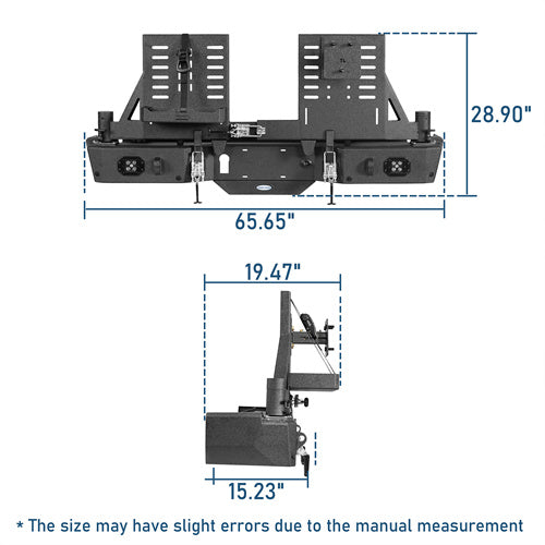 - Heavy-Duty 11-Gauge(1/8 in) steel plate for bumper main body, 9-gauge(5/32 in) steel plate for the mounting structure, 9-gauge(5/32 in) steel plate for the dual swing arms