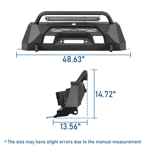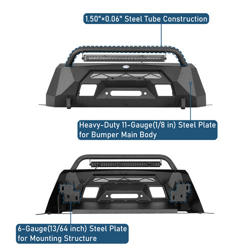 - Heavy-duty, high tensile 11-gauge (1/8 in) steel for the bumper main body, 1.50"×0.06" steel tube for bull bar, 6-gauge(13/64 in) steel for the mounting structure