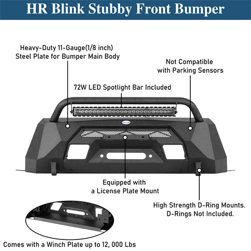 Aggressive Styling. The Blink Stubby Front Bumper is a rugged and stylish upgrade for off-road vehicles. Its low-profile grille bar guard offers enhanced protection while maintaining a sleek appearance. Featuring a 72W LED spotlight bar and honeycomb steel plate decoration, it combines functionality and design. High-strength D-ring mounts and a built-in winch plate supporting up to 12,000 lbs add versatility. A license plate mount is also included, ensuring practical daily use.