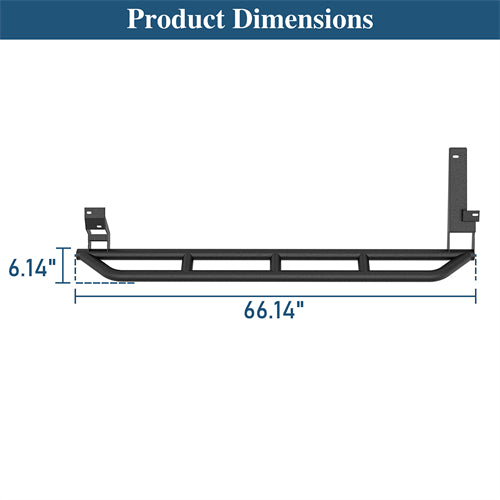 Heavy-Duty Tube Construction. Constructed from 1.9'' diameter steel tubing with a 0.06'' wall thickness, these rocker guards are built for strength and durability in demanding off-road conditions. The rugged steel structure provides reliable protection for the sides and undercarriage, while the premium dual-layer finish enhances longevity. A textured black powder coat on the outside provides a tough, stylish look, and the inside is treated with a premium E-coating process to resist rust and corrosion.