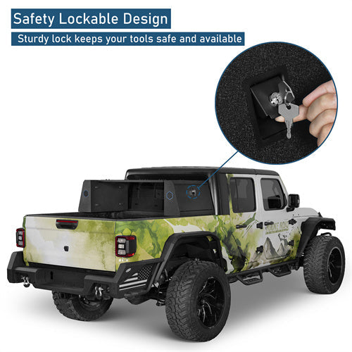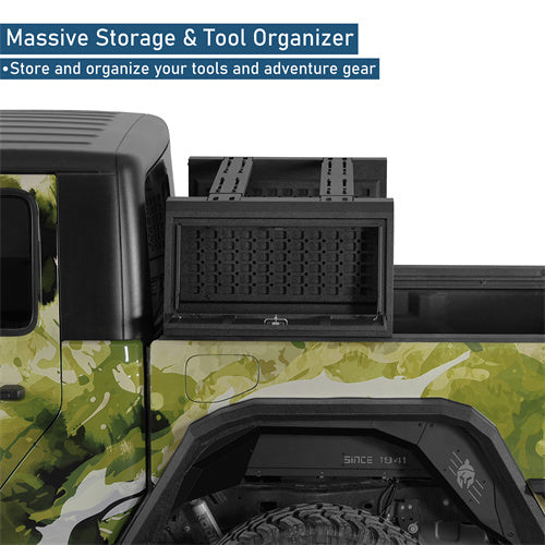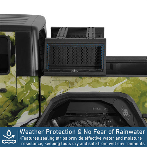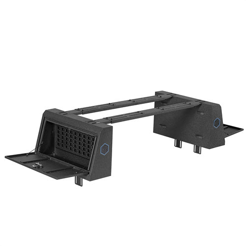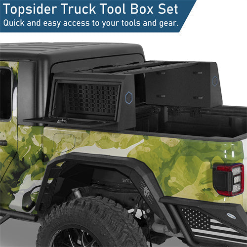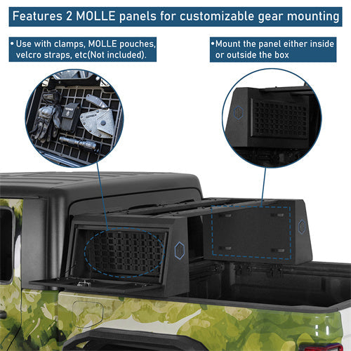 Massive Storage & Tool Organizer. The Topsider Truck Tool Box Set is a versatile and rugged storage solution designed to enhance utility and efficiency across a wide range of truck models. This dual-box system sits securely above the bed rails, offering easy access to tools and gear without the need to climb into the bed. With 2,700 cubic inches of storage space per box, there's plenty of room for recovery equipment, hand tools, and tie-downs. The inclusion of two MOLLE panels allows for customizable gear mounting with pouches, straps, or clamps—providing both organization and adaptability for off-road adventures or professional use. Reinforced crossbars boost stability and provide additional load-carrying capability up to 120 lbs.