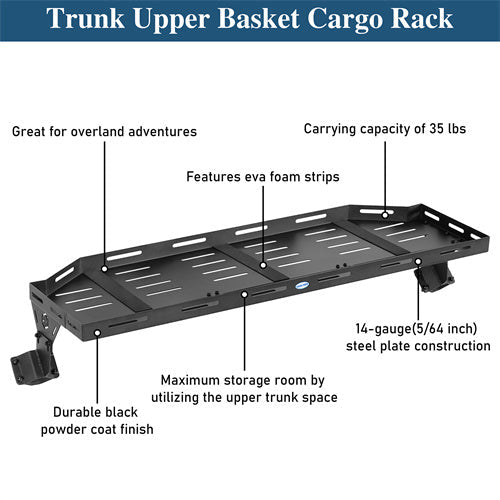 Storage Room Expanded. The Trunk Upper Basket Cargo Rack is a versatile and functional storage solution for Wrangler JK 4-Door Hardtop models. Designed to maximize storage by utilizing the upper trunk space, this cargo rack is ideal for organizing lightweight items such as clothing, ropes, and bags. With a load capacity of up to 35 lbs, it offers a secure space for additional gear, making it perfect for overlanding adventures. Its thoughtful design features a front panel with a turn-down opening, allowing for easy loading and unloading of luggage. The frame structure sits close to the roof, ensuring stability and preventing items from shifting or rolling off during travel. EVA foam strips are included to minimize vibration and noise, enhancing the overall experience.