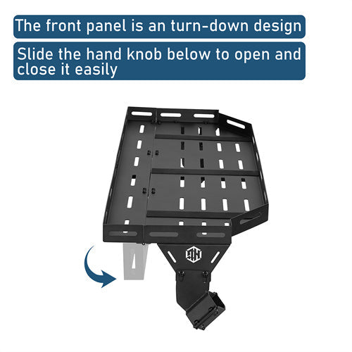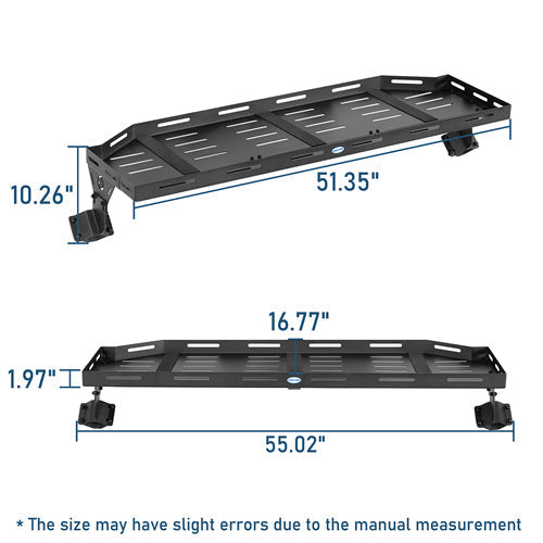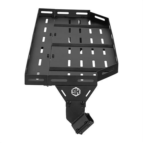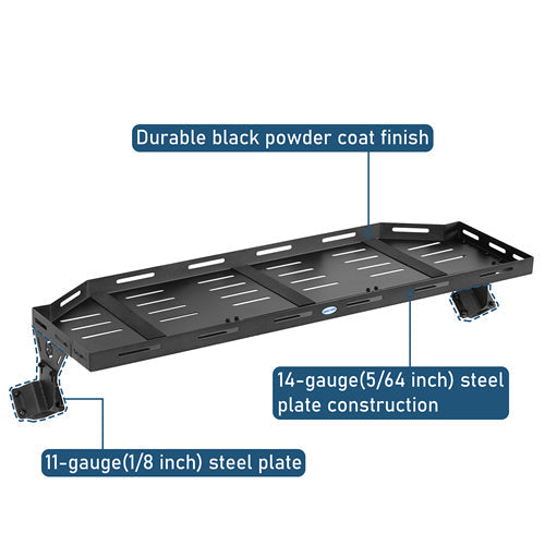 Heavy Duty Construction. This cargo rack is constructed from durable 14-gauge (5/64 inch) and 11-gauge (1/8 inch) steel sheet materials, ensuring its strength and reliability in various conditions. It is finished with a durable black powder coat that provides excellent resistance to rust, scratches, and wear, maintaining its rugged look over time. The sturdy steel construction and premium finish make this cargo rack an ideal companion for people who need extra storage for their outdoor adventures.