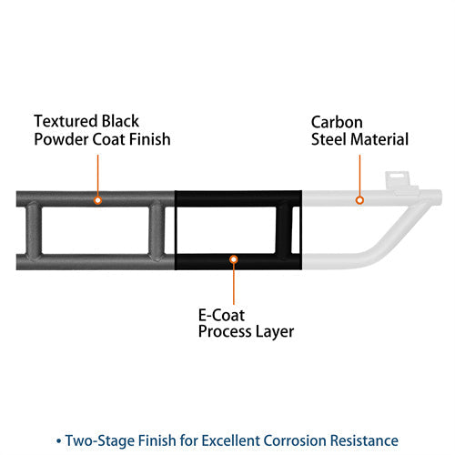 Heavy Duty Construction. Fabricated from robust 1.9"" diameter x 0.06"" thick steel tubing, these Tube Slider Rocker Guards boast exceptional strength. The textured black powder coat finish not only enhances their rugged appearance but also provides effective corrosion resistance. Employing a premium E-coating process on the interior ensures long-lasting durability against various elements. This combination of thick steel tubing and advanced coatings not only fortifies your Tacoma against off-road challenges but also adds a sleek, textured finish.