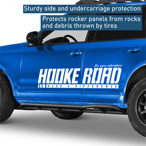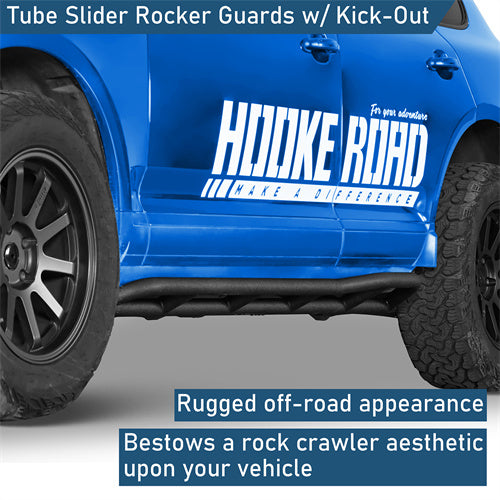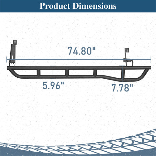 Heavy-Duty Tube Construction. Constructed from heavy-duty 1.9-inch diameter steel tubing with a wall thickness of 0.06 inches, these rocker guards are built to withstand harsh off-road conditions. A textured black powder coat finish enhances durability and corrosion resistance, while a premium E-coating process inside further protects the metal from rust and environmental wear.